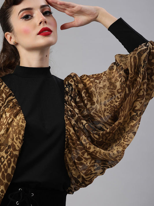 Kassually Black & Brown Colourblocked Batwing Sleeves Fitted Top