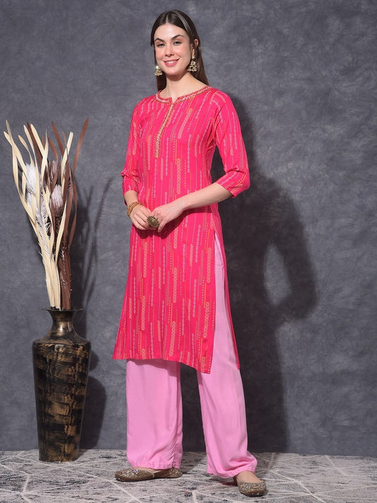 Dollar Missy Pink Printed Round Neck Thread Work Straight Kurta