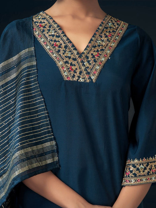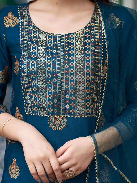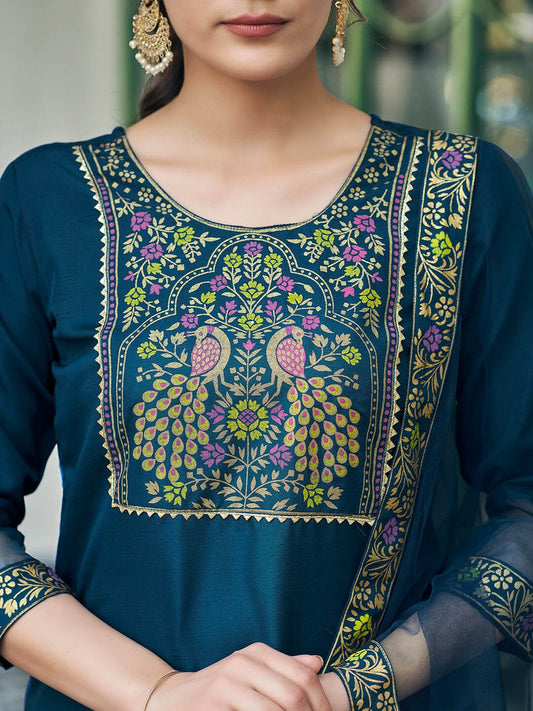 Skylee Teal Blue Ethnic Motifs Gotta Patti Kurta with Trouser & Dupatta