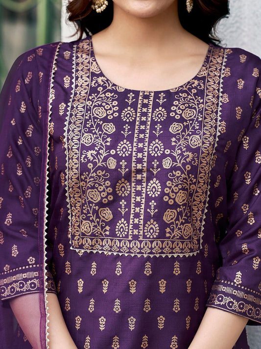 Skylee Purple Floral Printed Gotta Patti Kurta with Trouser & Dupatta