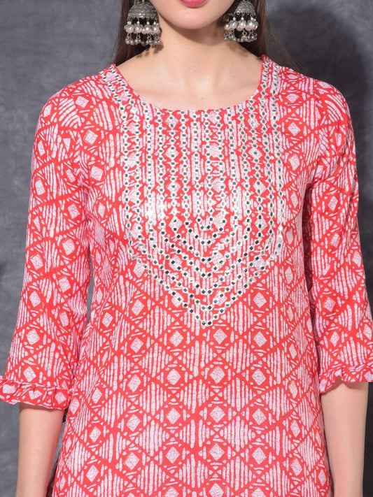 Dollar Missy Women Coral Geometric Printed Mirror Work Straight Kurta
