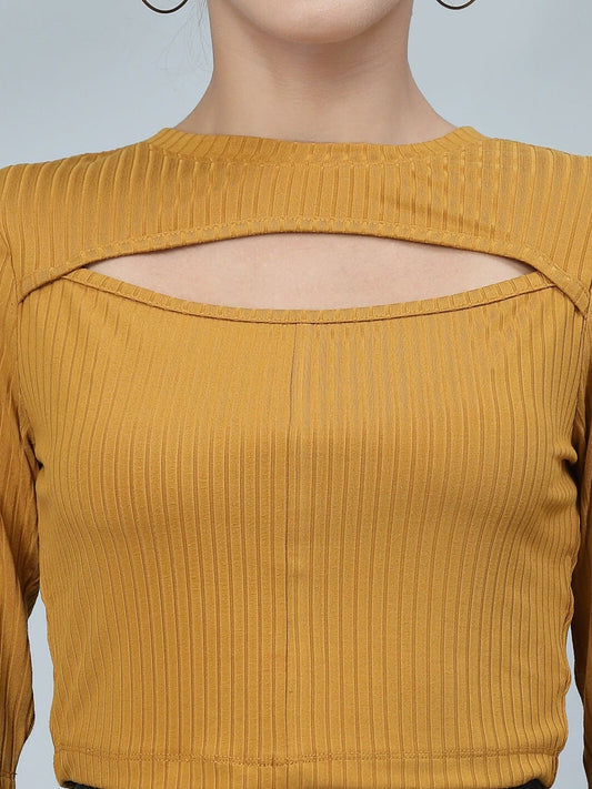 Kassually Mustard Yellow Ribbed Cut Out Crop Top
