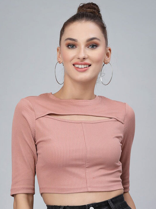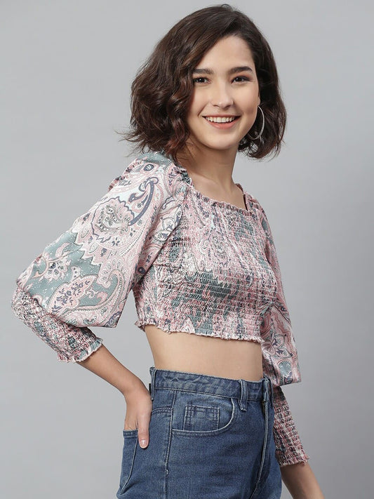 Kassually Pastel Pink Printed Puff Sleeves Smocked Fitted Crop Top