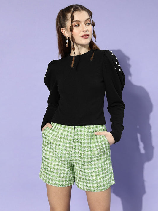 Kassually Women Brown Puff Sleeves Smocked Fitted Crop Top