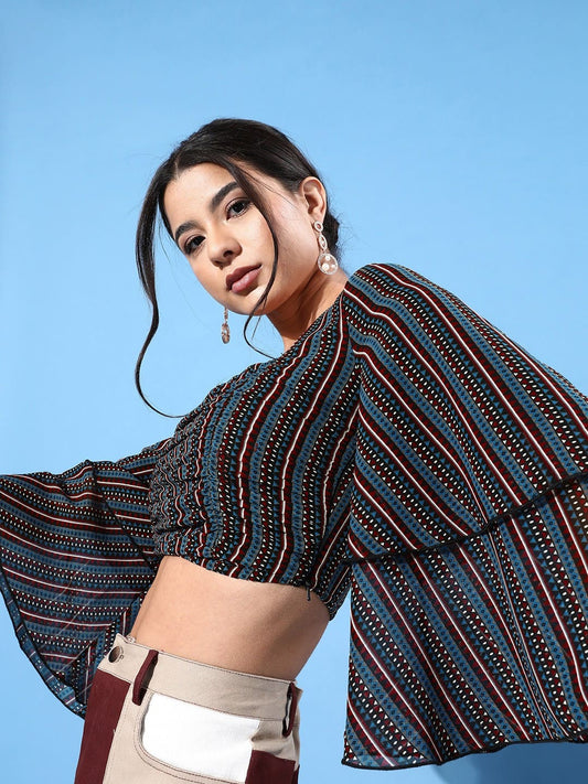Kassually Women Blue Floral Printed Cinched Waist Crop Top