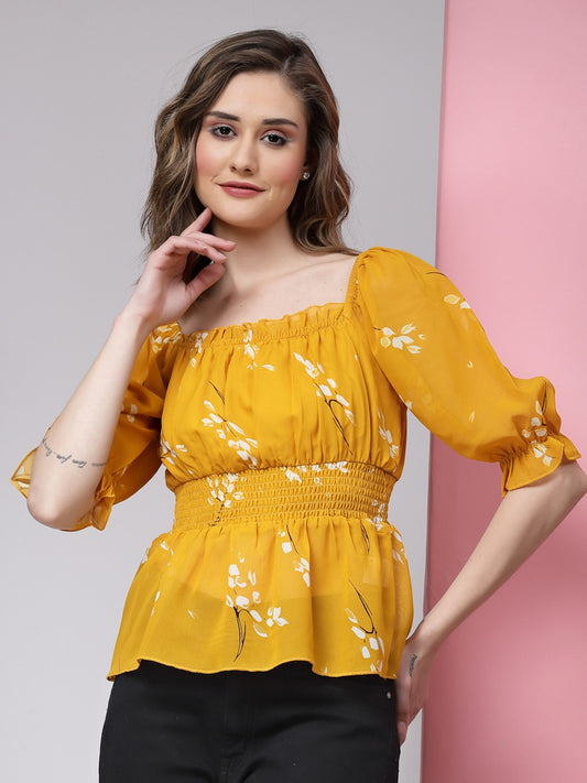 Kassually Yellow & White Floral Printed Cinched Waist Smocked Top