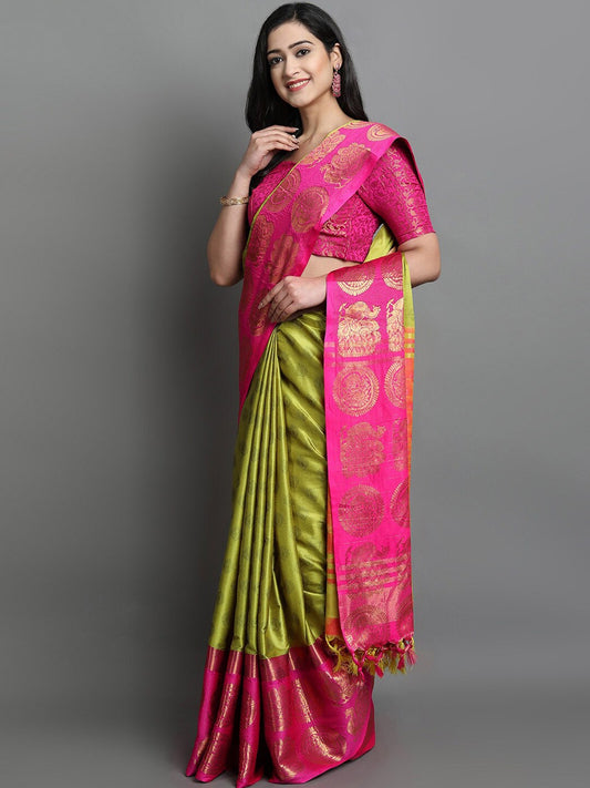 Lime Green & Pink Woven Design Zari Cotton Silk Dharmavaram Saree