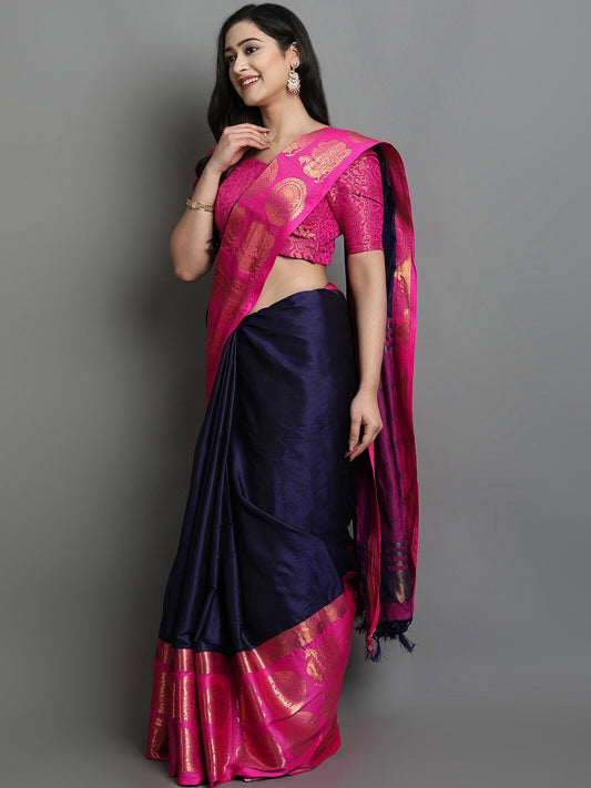 Navy Blue & Fuchsia Woven Design Zari Cotton Silk Dharmavaram Saree