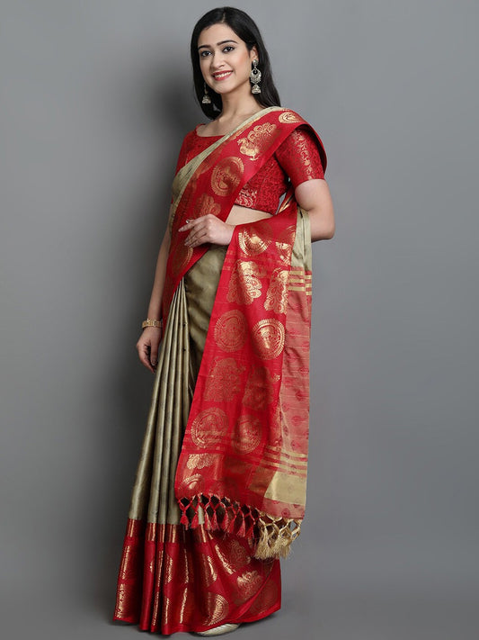 Beige & Red Woven Design Zari Cotton Silk Dharmavaram Saree