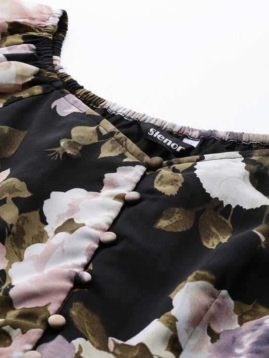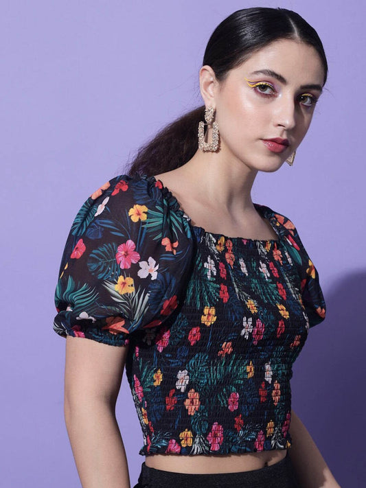 Slenor Black Floral Printed Puff Sleeves Fitted Crop Top