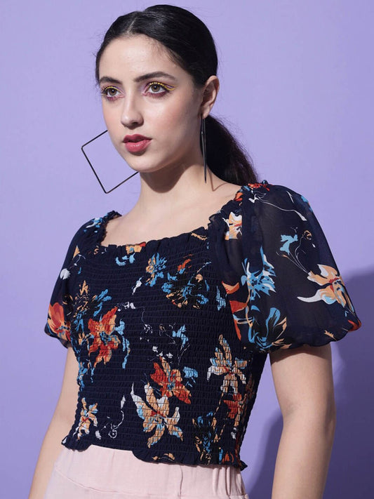 Slenor Navy Blue Floral Printed Puff Sleeves Fitted Crop Top