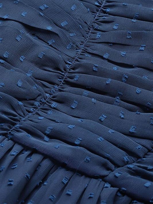 Slenor Navy Blue Sweetheart Neck Puff Sleeve Peplum Top