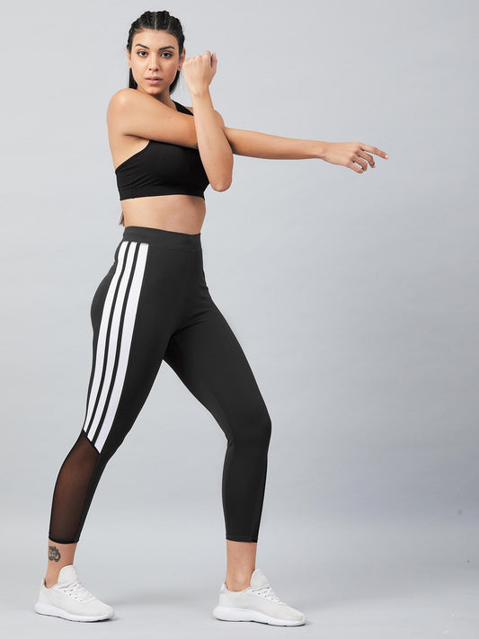 Women Black 3 Stripes Tights With Breathable Mesh Panels