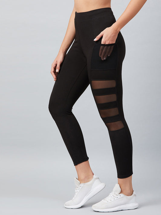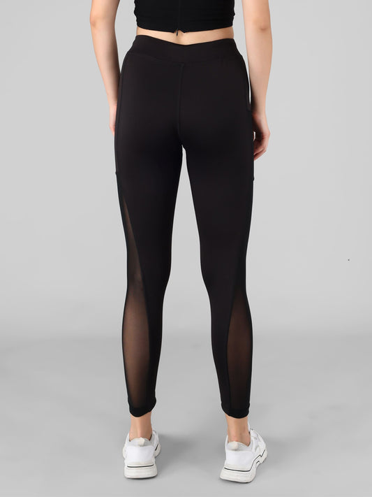 Women Black Rapid Dry Tights with Breathable Mesh Panels