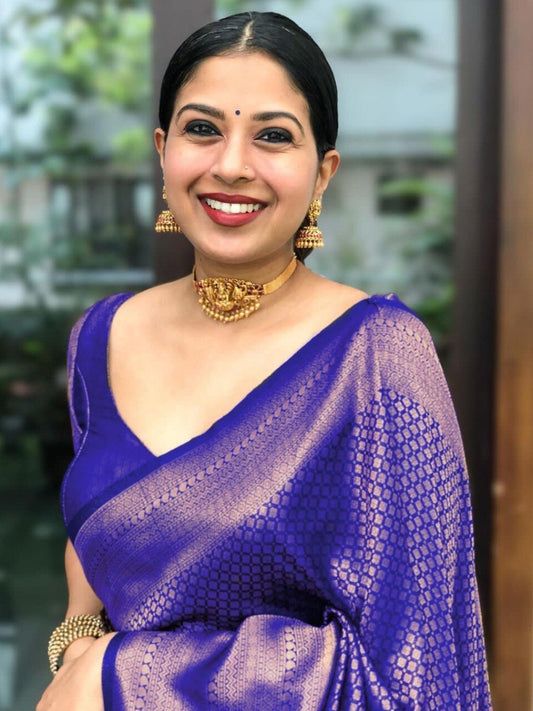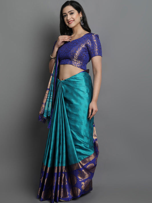 Blue & Gold-Toned Woven Design Zari Cotton Silk Dharmavaram Saree