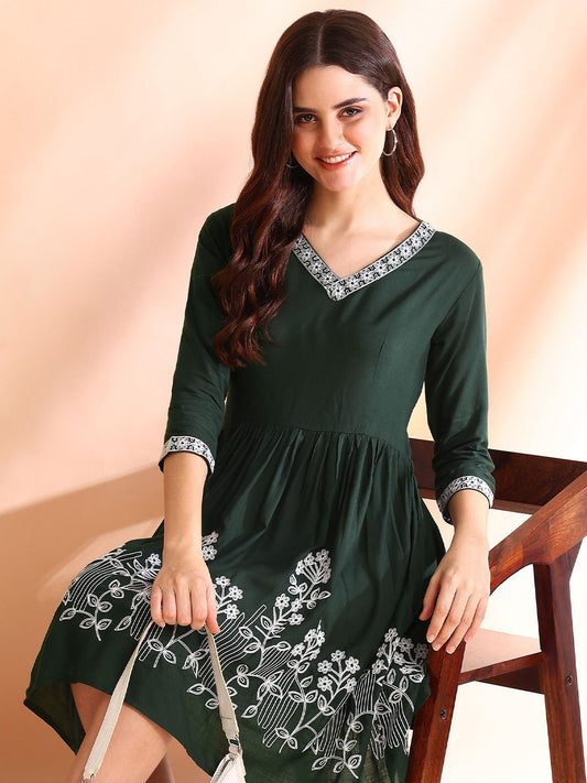 Women Green Floral Embroidered Fit and Flare Dress