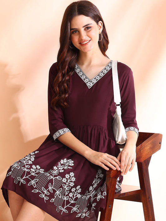 Women Maroon Floral Embroidered Fit and Flare Dress