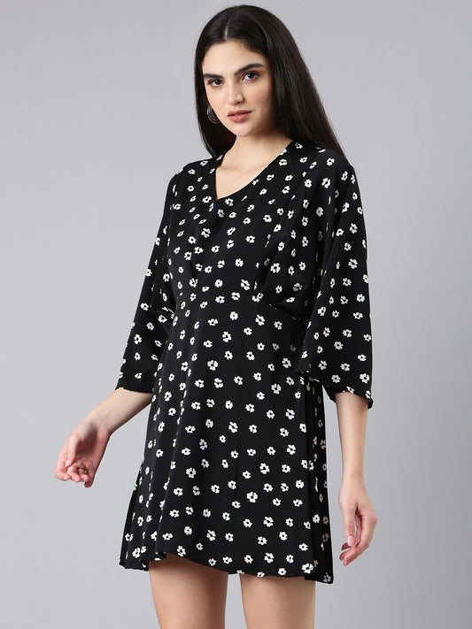 SHOWOFF Black & White Floral Printed Flared Sleeve A-Line Dress