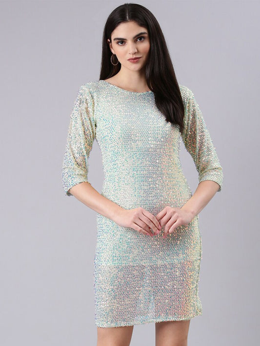 SHOWOFF Off White Embellished Sequined Net Sheath Dress