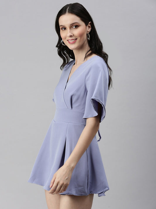 SHOWOFF Purple Solid V-Neck Flared Sleeves A-Line Mini Dress