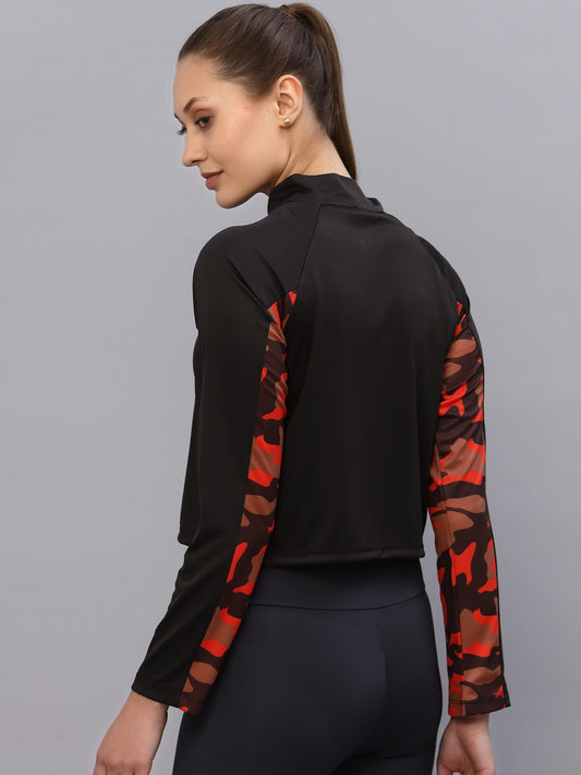 Rigo Black Colourblocked Zip Neck Full Sleeve Activewear Crop Top
