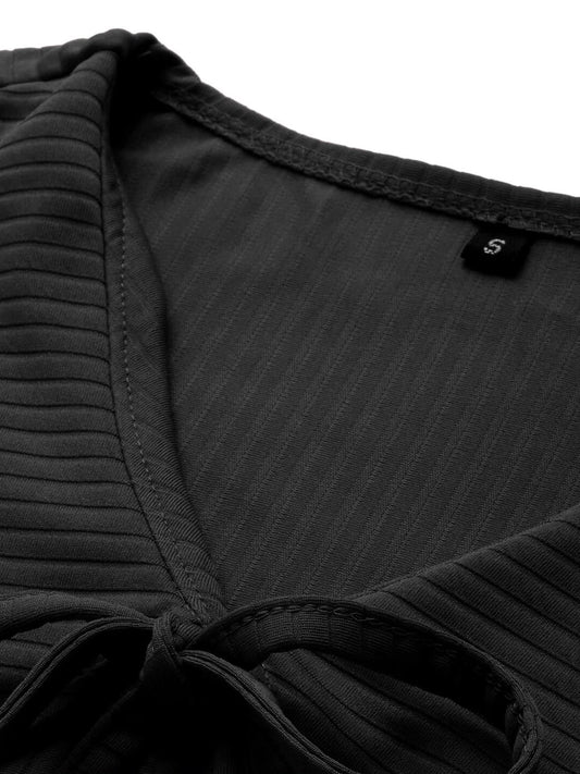 Selvia Black Tie-Up Detail Puff Sleeves Shirt Style Crop Top