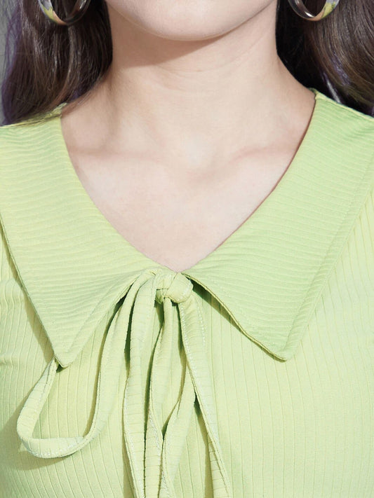 Selvia Green Tie-Up Detail Puff Sleeves Shirt Style Crop Top