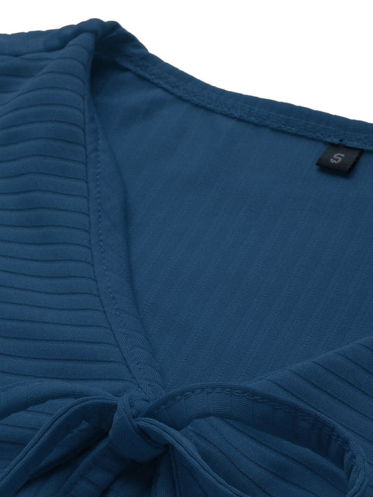 Selvia Navy Blue Tie-Up Detail Puff Sleeves Shirt Style Crop Top