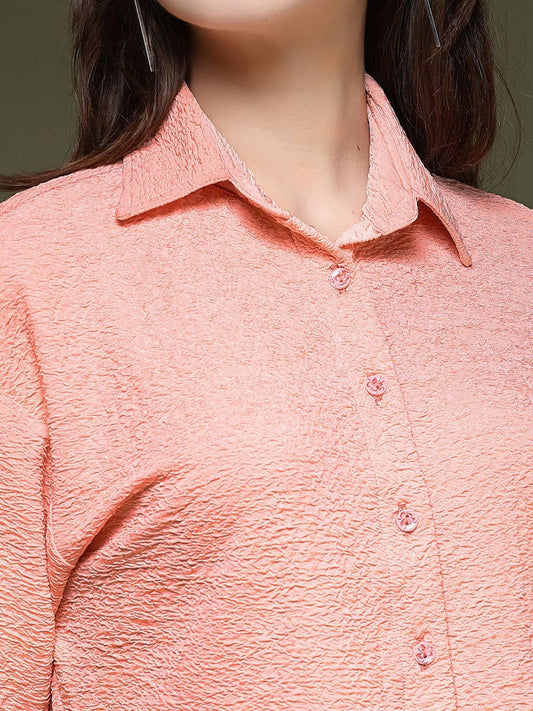 Selvia Peach Self Design Textured Spread Collar Crop Casual Shirt