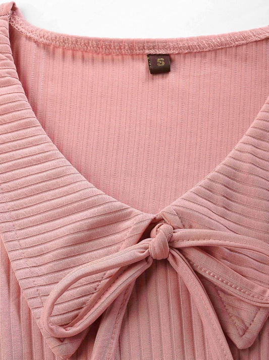 Selvia Pink Tie-Up Detail Puff Sleeves Shirt Style Crop Top