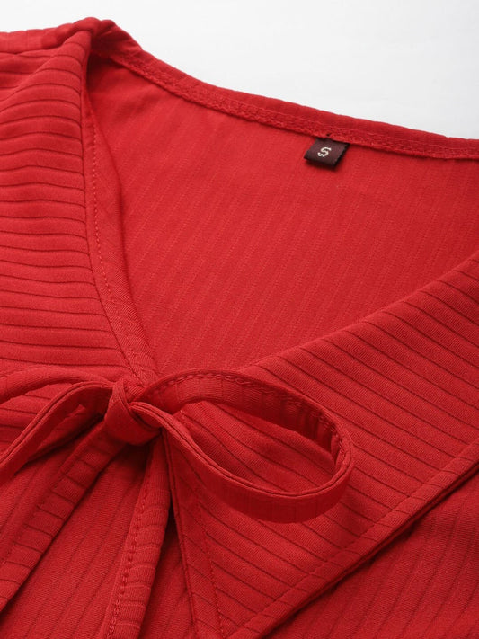 Selvia Red Tie-Up Detail Puff Sleeves Shirt Style Crop Top
