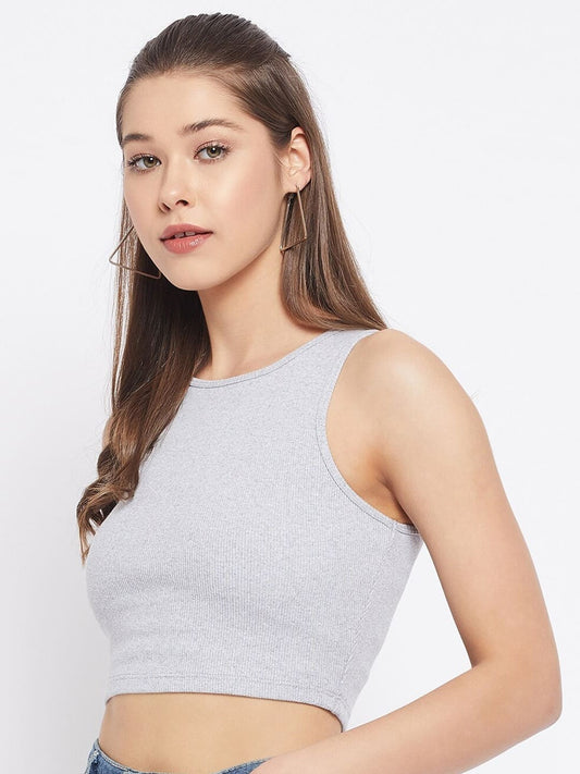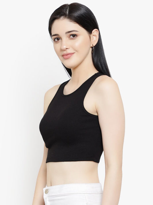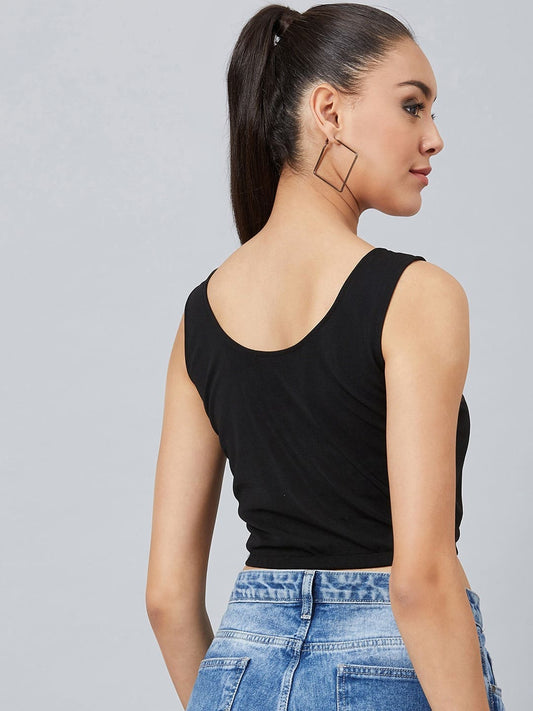 Women Black Solid Scoop Neck Sleeveless Crop Top