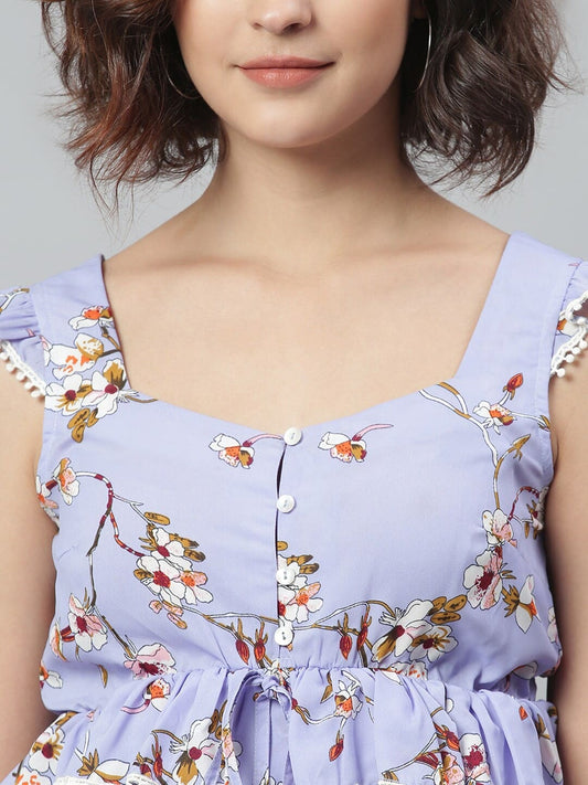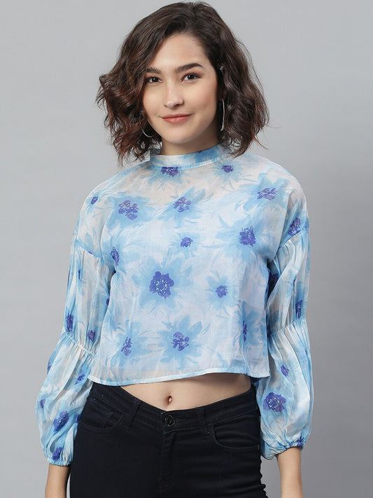 Kassually Women Blue Floral Printed Cinched Waist Crop Top