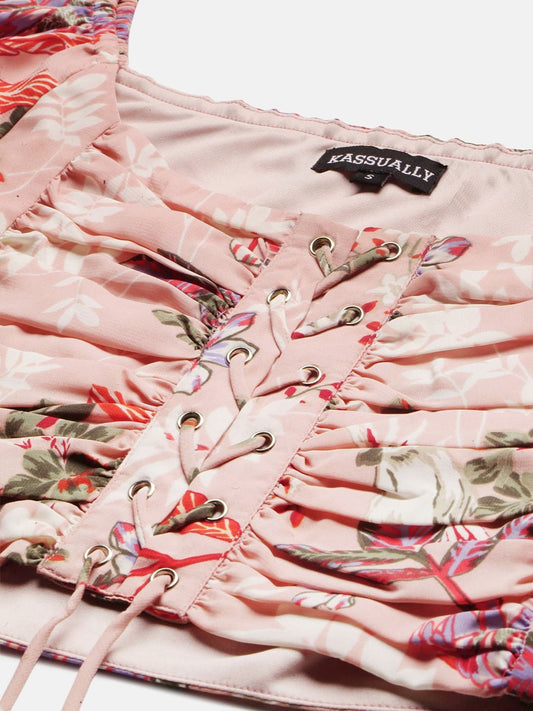 Kassually Women Peach and White Floral Print Ruched Crop Top