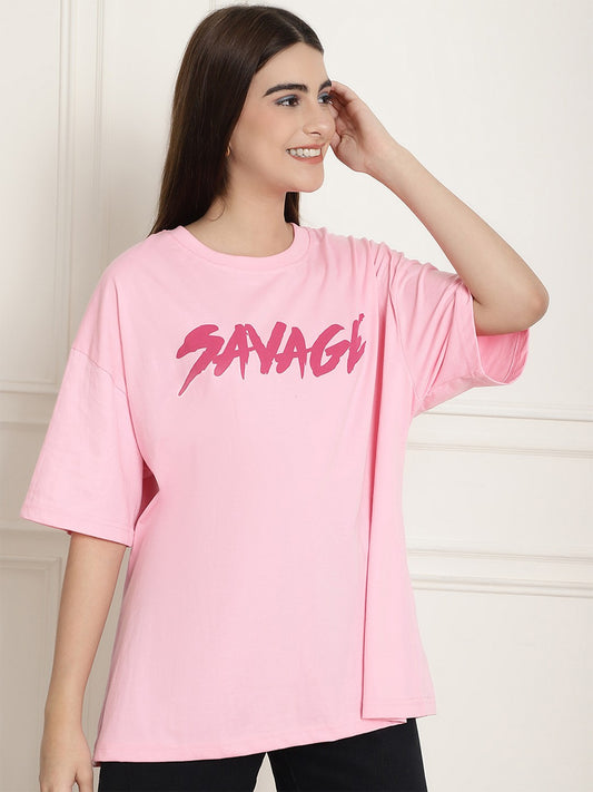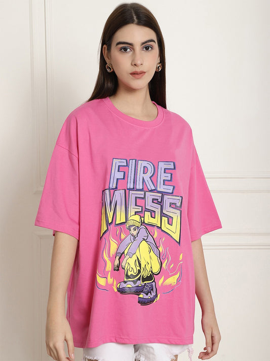 Women Pink Graphic Printed Drop-Shoulder Cotton Oversized T-Shirt