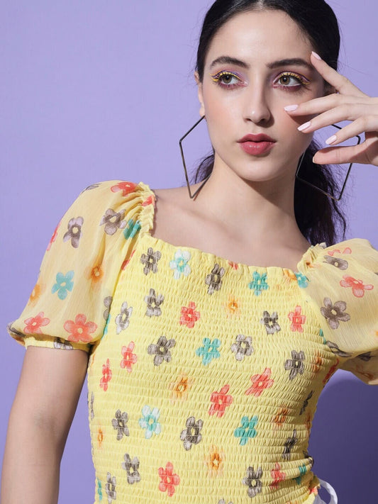 Slenor Yellow Floral Printed Puff Sleeves Fitted Crop Top